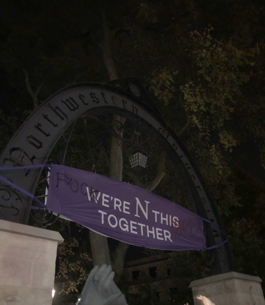 Once we got to the front gate (“the Arch”) of campus, someone tagged the NU university sign with abolitionist messaging. When everybody arrived at the arch, they tagged it the fuck up. We ripped down the president’s condescending “we’re N this together” banner, and burned it while the crowd danced to “burn baby burn.” Someone said over the mic asked the streets, “How can we be in over this together when service workers are being laid off without pay or not being given hazard pay?”
