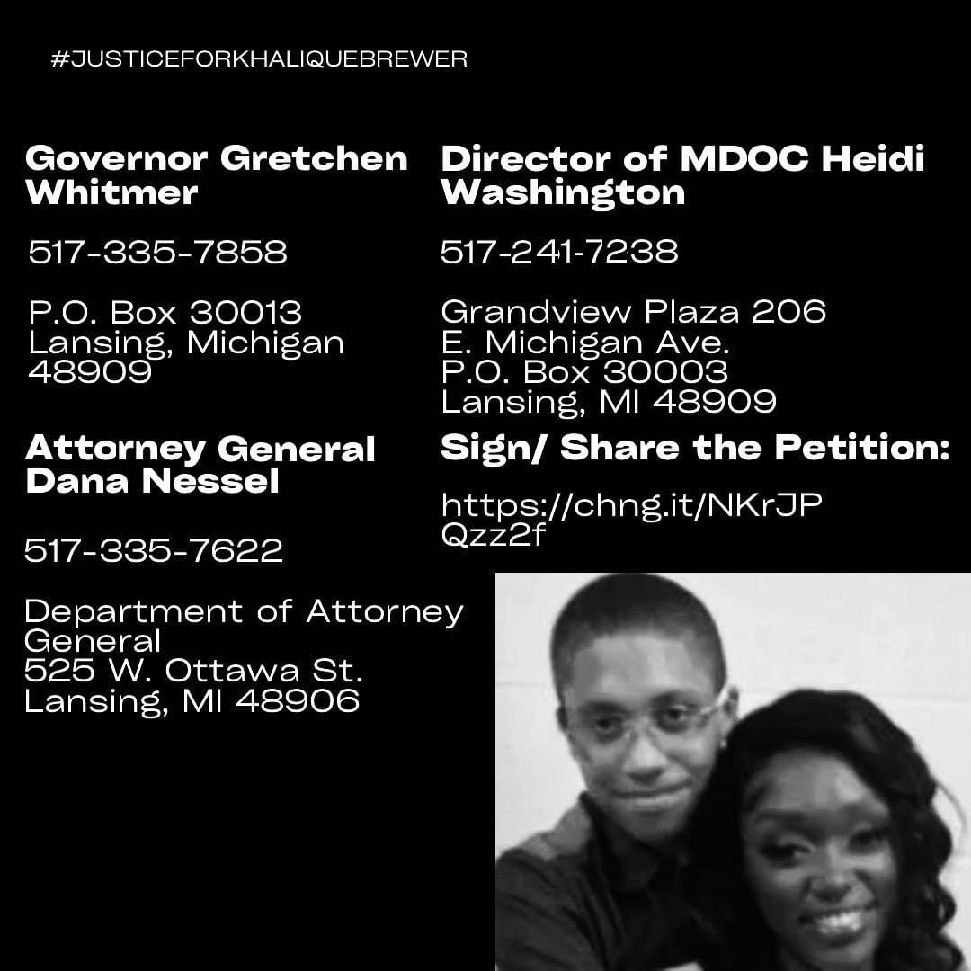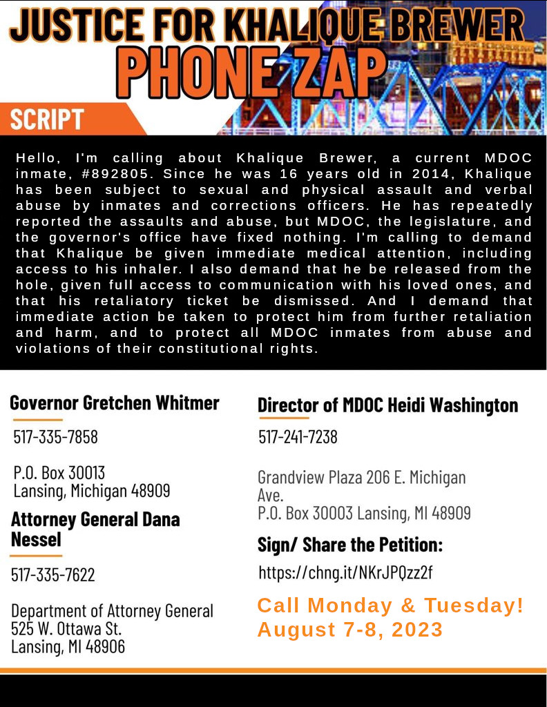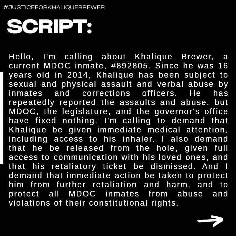 “Hello, I’m calling about Khalique Brewer, a current MDOC inmate, #892805. Since he was 16 years old in 2014, Khalique has been subject to sexual and physical assault and verbal abuse by inmates and corrections officers. He has repeatedly reported the assaults and abuse, but MDOC, the legislature, and the governor’s office have fixed nothing. I’m calling to demand that Khalique be given immediate medical attention, including access to his inhaler. I also demand that he be released from the hole, given full access to communication with his loved ones, and that his retaliatory ticket be dismissed. And I demand that immediate action be taken to protect him from further retaliation and harm, and to protect all MDOC inmates from abuse and violations of their constitutional rights.”